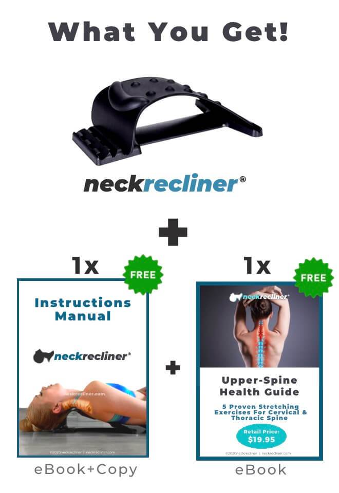 NeckRecliner® Cervical and Thoracic Stretcher is a small lightweight multi-level neck and thoracic traction device that helps your neck recline and relax immediately, and quickly relieve neck, shoulder and upper back pain due to tight muscles, excessive flexion, and poor spinal alignment.